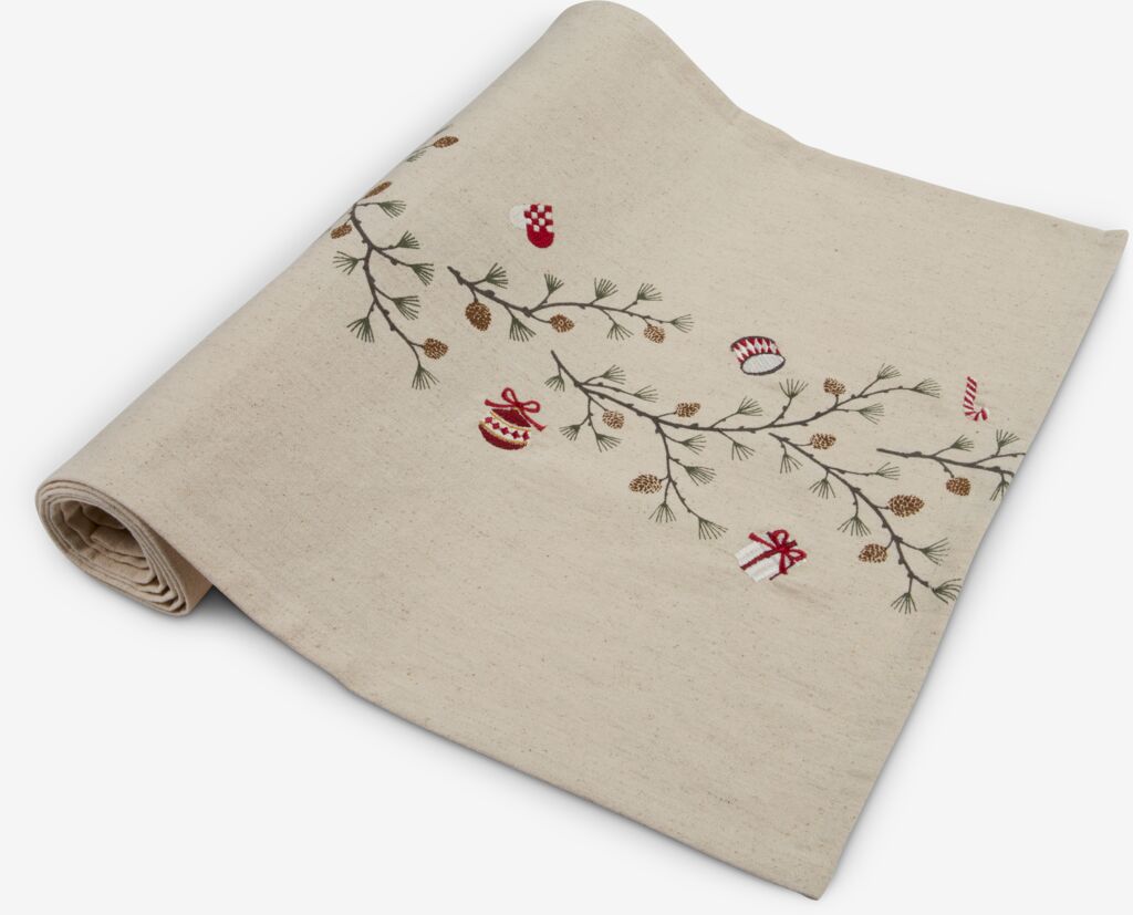 Neutraalin värisestä puuvilla-pellavasekoitteesta valmistettu kaitaliina, jossa on hillitty printtikuvio ja jouluisia kirjailuja. Luo jouluisen kotoisaa tunnelmaa ruokapöytään. 40x150 cm