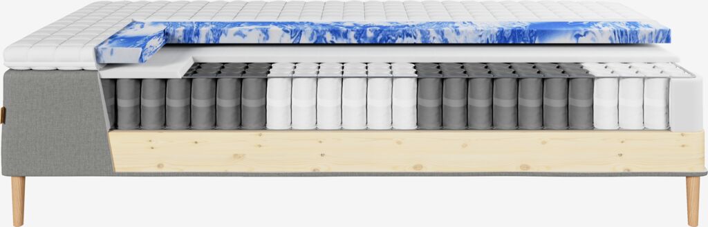 Runkopatja 105x200 cm pussijousilla 249/m², pehmustettu polyeetterivaahtomuovilla. Sis. 5 cm paksun sijauspatjan painetta keventävällä geelivaahtomuoviytimellä, joka muotoutuu vartalon mukaan ja poistaa ylimääräistä lämpöä. Pestävä päällinen 100% polyesteriä (100% kierrätetty) pehmeällä, paksulla tikkauksella. Ilman jalkoja/taivutejalkoja.