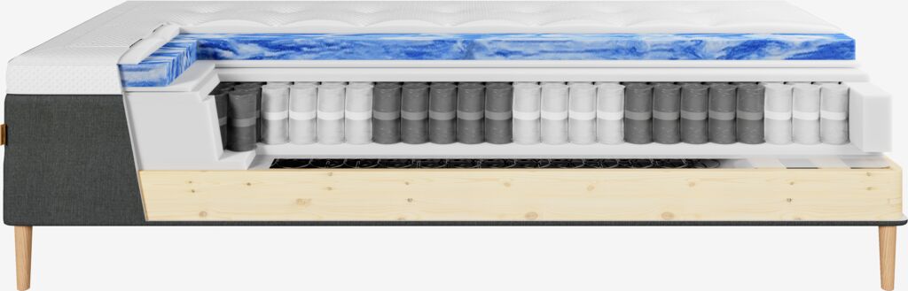 Kaksoisjousitettu runkopatja 140x200 cm, joka on jaettu 7 mukavuusvyöhykkeeseen, jotka tarjoavat ainutlaatuisen ergonomisen tuen. Päällimmäisessä kerroksessa on pussijousia 248/m², pehmustettu polyeetterivaahtomuovilla. Alemmassa kerroksessa on bonnell-jousia 113/m². Sis. 10 cm paksun sijauspatjan painetta keventävällä geelivaahtomuoviytimellä, joka muotoutuu vartalon mukaan ja poistaa ylimääräistä lämpöä. Päällisessä on pehmeä, paksu tikkaus sekä viilentävää polyeteeniä yhdellä puolella, jolla on välitön viilentävä vaikutus. Ilman jalkoja.