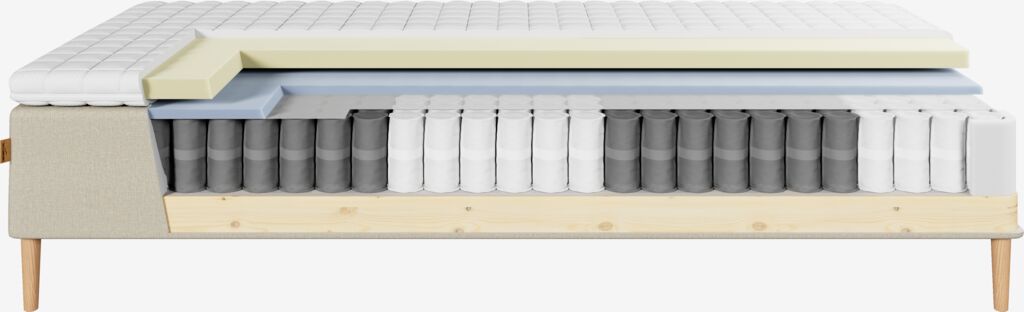 Runkopatja 160x200 cm pussijousilla 246/m², pehmustettu Comfort+ -vaahtomuovilla. Patja on jaettu 5 mukavuusvyöhykkeeseen, jotka tarjoavat tarkan, optimaalisen tuen. Sis. 5 cm paksun sijauspatjan painetta keventävällä memory-vaahtomuoviytimellä, joka muotoutuu tarkasti vartalon mukaan. Pestävä päällinen 100% polyesteriä (100% kierrätetty) pehmeällä, paksulla tikkauksella. Pohja koostuu 2 runkopatjasta. Ilman jalkoja/taivutejalkoja.