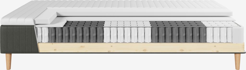 Runkopatja 160x200 cm pussijousilla 246/m², pehmustettu polyeetterivaahtomuovilla. Patja on jaettu 5 mukavuusvyöhykkeeseen, jotka tarjoavat tarkan, optimaalisen tuen. Sis. 4 cm paksun sijauspatjan polyeetterivaahtomuovilla. Pestävä päällinen 100% polyesteriä (100% kierrätetty) paksulla tikkauksella. Ilman jalkoja/taivutejalkoja.