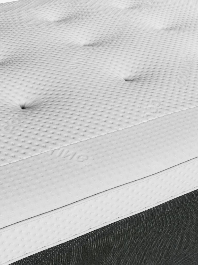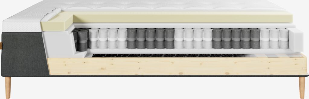 Kaksoisjousitettu runkopatja 180x200 cm, joka on jaettu 7 mukavuusvyöhykkeeseen, jotka tarjoavat ergonomista tukea. Päällimmäisessä kerroksessa on pussijousia 248/m², pehmustettu polyeetterivaahtomuovilla. Alemmassa kerroksessa on bonnell-jousia 113/m². Sis. 8 cm paksun sijauspatjan hengittävällä lateksiytimellä, joka poistaa tehokkaasti ylimääräistä lämpöä. Päällinen 100% polyesteriä (60% kierrätetty) pehmeällä, paksulla tikkauksella. Päällisessä on lämpötilaa sääteleviä mikrokapseleita, jotka luovat kuivan ja miellyttävän nukkumisympäristön. Pohja koostuu 2 runkopatjasta. Ilman jalkoja.