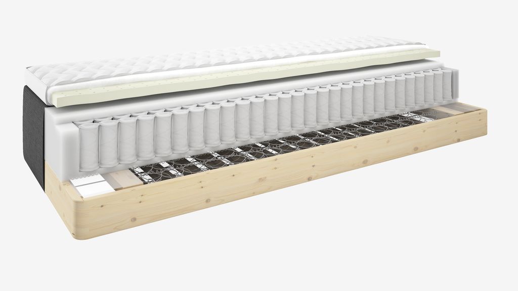 Kaksoisjousitettu runkopatja 80x200 cm 7 mukavuusvyöhykkeellä tarjoaa tarkan, optimaalisen tuen. Yläjousistossa 250 pussijousta/m², pehmustettu korkeakimmoisella vaahtomuovilla ja polyeetterivaahtomuovilla. Alajousistossa 150 mini-Bonnell-jousta/m². Sis. 8 cm paksun sijauspatjan hengittävällä lateksiytimellä, joka johtaa tehokkaasti ylimääräistä lämpöä pois. Pestävä joustopäällinen pehmeällä, paksulla tikkauksella. Ilman jalkoja/taivutejalkoja.