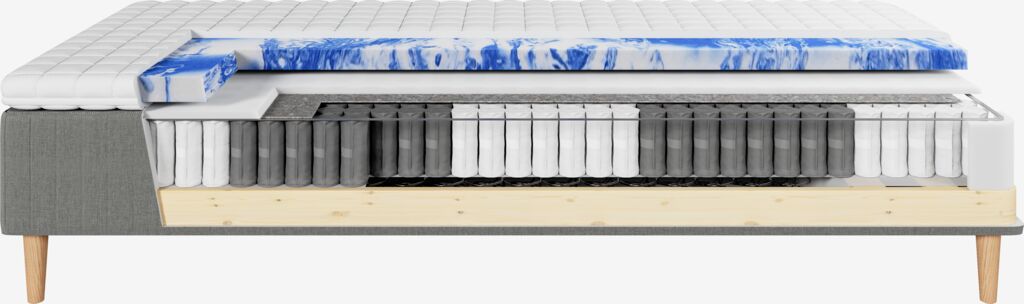 Kaksoisjousitettu runkopatja 80x200 cm, joka on jaettu 5 mukavuusvyöhykkeeseen, jotka tarjoavat tarkan, optimaalisen tuen. Päällimäisessä kerroksessa on pussijousia 246/m², pehmustettu polyeetterivaahtomuovilla. Alemmassa kerroksessa on bonnell-jousia 150/m². Sis. 5 cm paksun sijauspatjan painetta keventävällä geelivaahtomuoviytimellä, joka muotoutuu vartalon mukaan ja poistaa ylimääräistä lämpöä. Pestävä päällinen 100% polyesteriä (100% kierrätetty) pehmeällä, paksulla tikkauksella. Ilman jalkoja/taivutejalkoja.