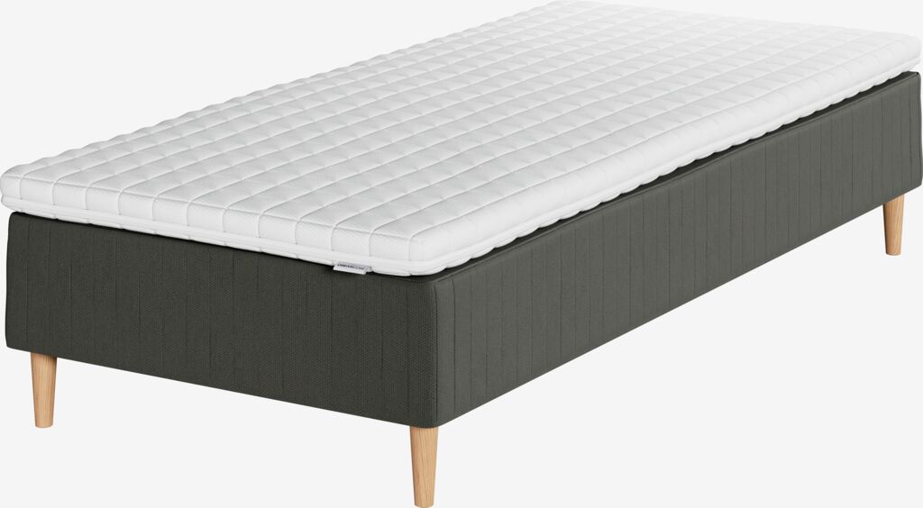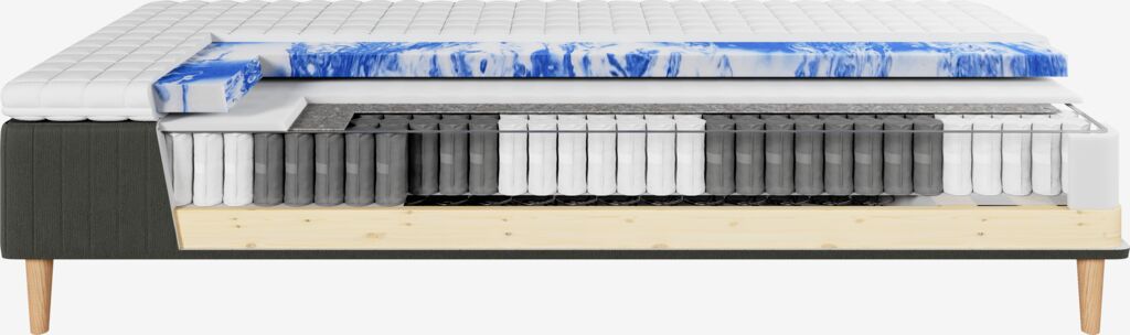 Kaksoisjousitettu runkopatja 80x200 cm, joka on jaettu 5 mukavuusvyöhykkeeseen, jotka tarjoavat tarkan, optimaalisen tuen. Päällimmäisessä kerroksessa on pussijousia 246/m², pehmustettu polyeetterivaahtomuovilla. Alemmassa kerroksessa on bonnell-jousia 150/m². Sis. 5 cm paksun sijauspatjan painetta keventävällä geelivaahtomuoviytimellä, joka muotoutuu vartalon mukaan ja poistaa ylimääräistä lämpöä. Pestävä päällinen 100% poleysteriä (100% kierrätetty) pehmeällä, paksulla tikkauksella. Ilman jalkoja.