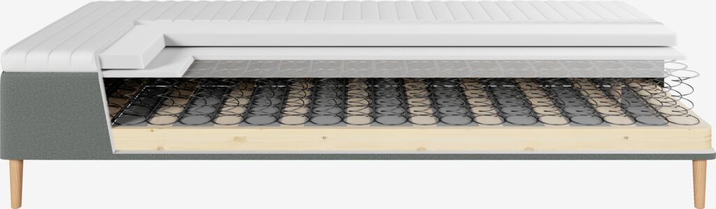Runkopatja 80x200 cm bonnell-jousilla 111/m², pehmustettu polyeetterivaahtomuovilla. Sis. 4 cm paksun sijauspatjan polyeetterivaahtomuoviytimellä. Pestävä päällinen 100% polyesteriä (100% kierrätetty) paksulla tikkauksella. Ilman jalkoja/taivutejalkoja.