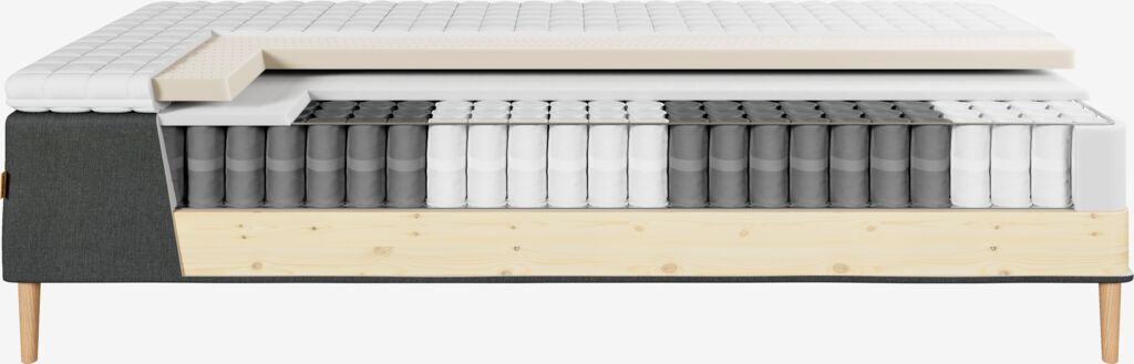 Runkopatja 90x200 cm pussijousilla 249/m², pehmustettu polyeetterivaahtomuovilla. Sis. 5 cm paksun sijauspatjan hengittävällä lateksiytimellä, joka johtaa tehokkaasti ylimääräistä lämpöä pois. Pestävä päällinen 100% polyesterimikrokuitua (100% kierrätetty) pehmeällä, paksulla tikkauksella. Ilman jalkoja/taivutejalkoja.