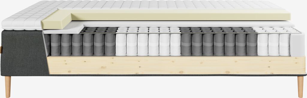 Runkopatja 90x200 cm pussijousilla 249/m², pehmustettu polyeetterivaahtomuovilla. Sis. 5 cm paksun sijauspatjan painetta keventävällä memory-vaahtomuoviytimellä, joka muotoutuu tarkasti vartalon mukaan. Pestävä päällinen 100% polyesteriä (100% kierrätetty) pehmeällä, paksulla tikkauksella. Ilman jalkoja.