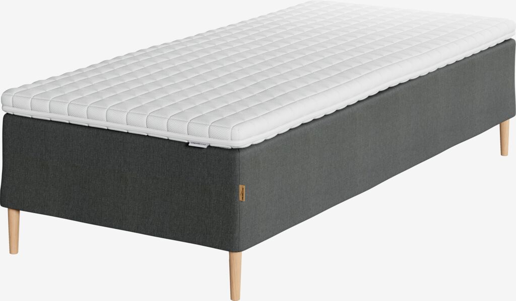 Runkopatja 90x200 cm pussijousilla 249/m², pehmustettu polyeetterivaahtomuovilla. Sis. 5 cm paksun sijauspatjan painetta keventävällä memory-vaahtomuoviytimellä, joka muotoutuu tarkasti vartalon mukaan. Pestävä päällinen 100% polyesteriä (100% kierrätetty) pehmeällä, paksulla tikkauksella. Ilman jalkoja.