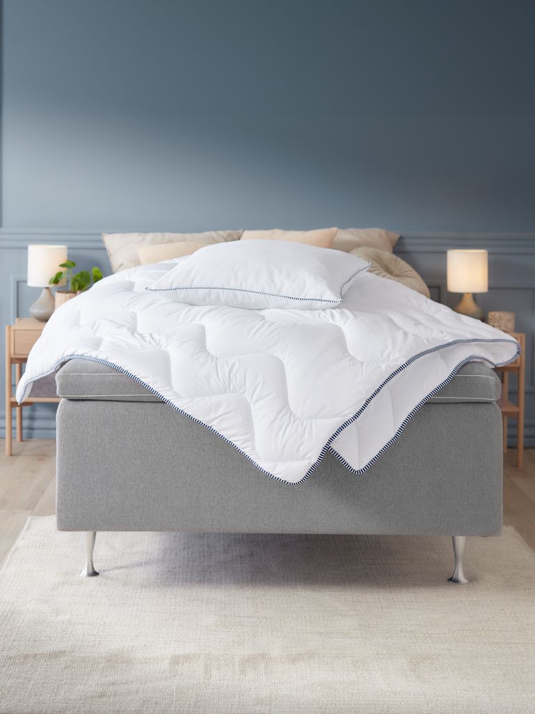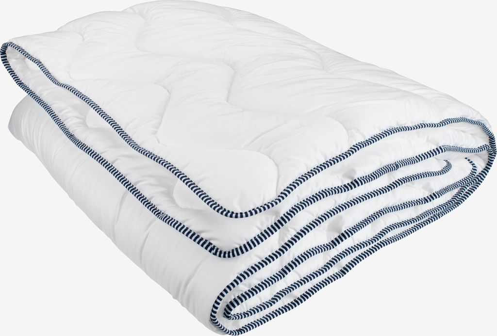 Valkopesun kestävä kuitupeitto 150x210 cm kevyellä, ilmavalla täytteellä silikonoitua, spiraalinmuotoista ontelokuitua (100 % kierrätetty), 550 g. 50 % puuvilla-/50 % polyesteripäällinen. Pesu 95°C.