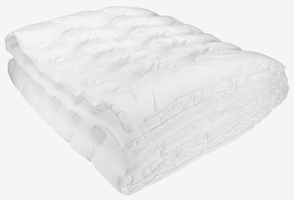 Valkopesun kestävä kuitupeitto 150x210 cm ilmavalla, eristävällä silikonoidulla spiraalinmuotoisella ontelokuitutäytteellä, 1100 g. 65 % polyesteri-/35 % puuvillapäällinen. Pesu 95°C.
