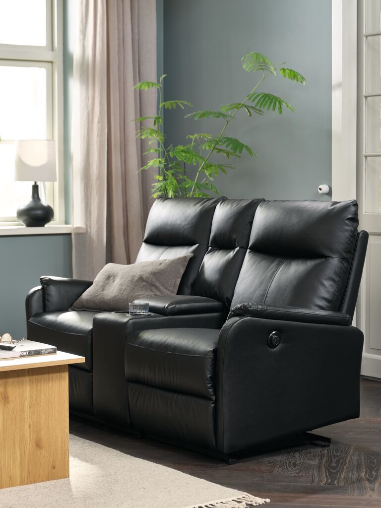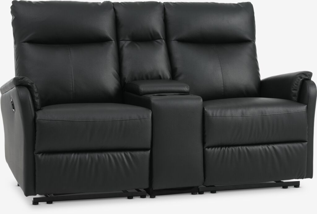 Sohvaryhmä, johon sisältyy 1 sohva ja 1 keskikonsi. 2-istuttava sohva: Keinonahka. Istuinpehmuste pussijousilla ja vaahtomuovipehmusteella. Selkäpehmuste vaahtomuovia. Sähkökäyttöinen portaaton kallistusmekanismi ja sisäänrakennettu jalkatuki. L168 x K103 x S90 cm. Keskikonsoli: Sis. mukitelineen ja säilytyslokeron.