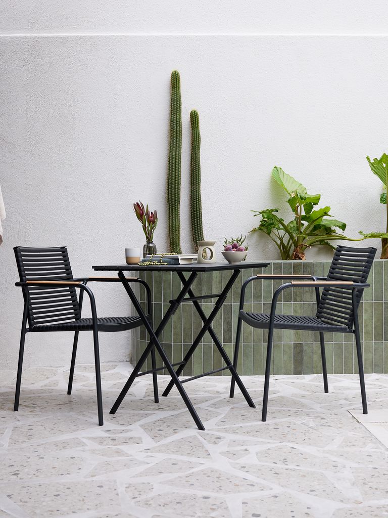 2-istuttava parvekekalustesetti. Pöytä: Teräs ja puujäljitelmä. Kokoontaitettava. L65 x P65 x K73 cm. Tuoli: Alumiini ja UV-suojattu muovi. Pinottava.