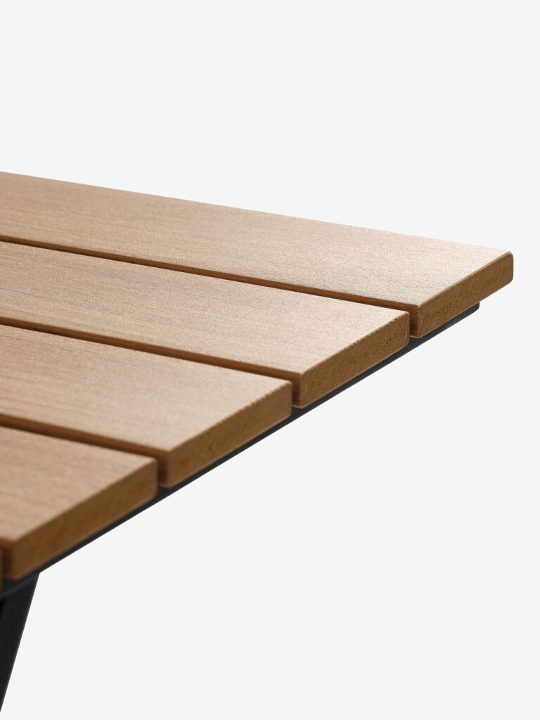 | Materiaali | Runko: Teräs, Pöytälevy: Puujäljitelmä on huoltovapaa synteettinen materiaali joka jäljittelee luonnollisen puun rakennetta. Se on tehty muovista, kuten polystyreenistä, joka on kestävä ja vettähylkivä materiaali. Puujäljitelmä on UV-suojattu, mikä takaa värien hyvän säilymisen pinnoilla. |