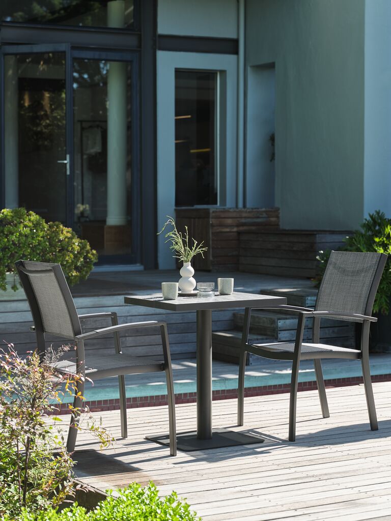 2-istuttava parvekekalustesetti. Pöytä: Alumiini, teräs ja keramiikka. L59 x P60 x K71 cm. Tuoli: Alumiini ja verkkopunos. Pinottava.