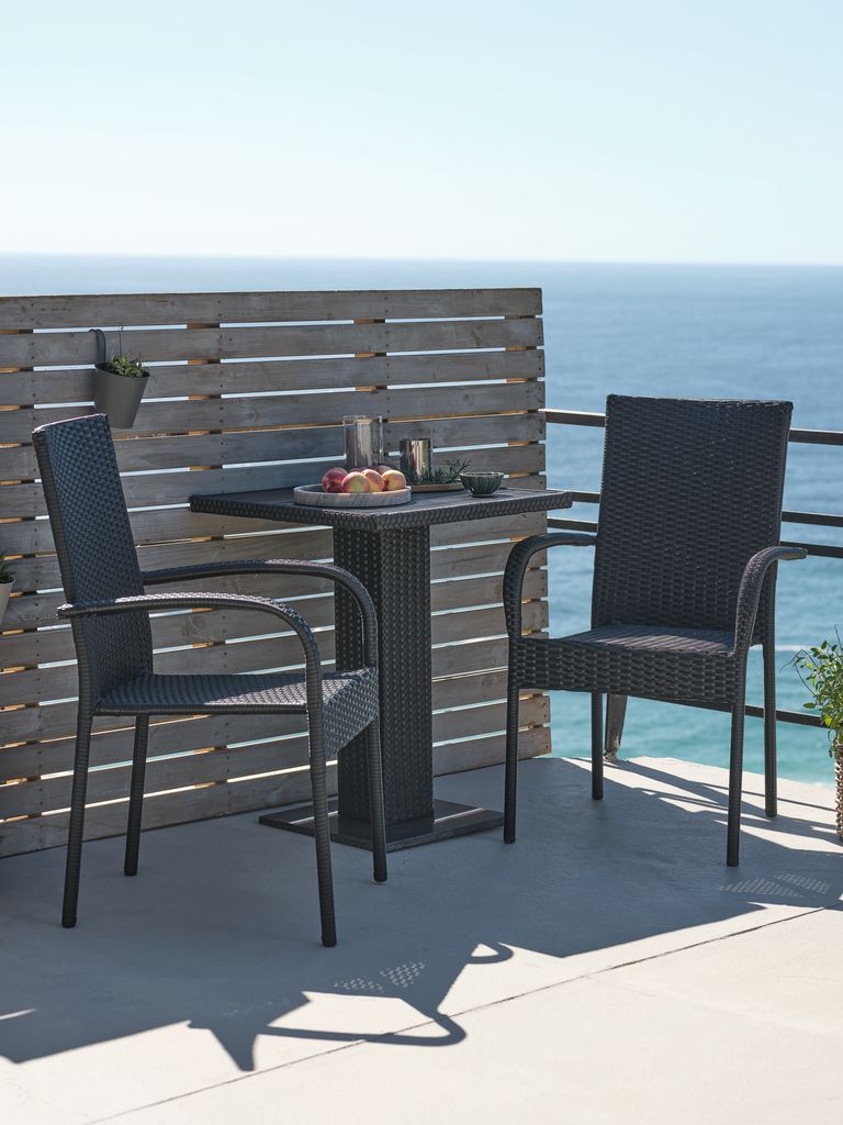 2-istuttava parvekekalustesetti. Pöytä: Alumiini, graniitti, polyrottinki ja puujäljitelmä. L60 x P60 x K74 cm. Tuoli: Teräs ja polyrottinki. Pinottava.
