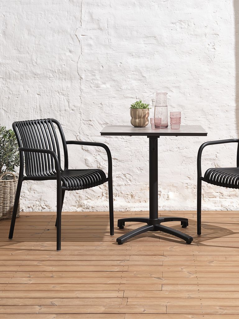 2-istuttava parvekekalustesetti. Pöytä: Alumiini ja korkeapainelaminaatti. Pöydän kansi voidaan nostaa kokonaan pystyyn pienissä tiloissa säilytystä varten. L70 x P70 x K73 cm. Tuoli: UV-suojattu muovi. Pinottava.