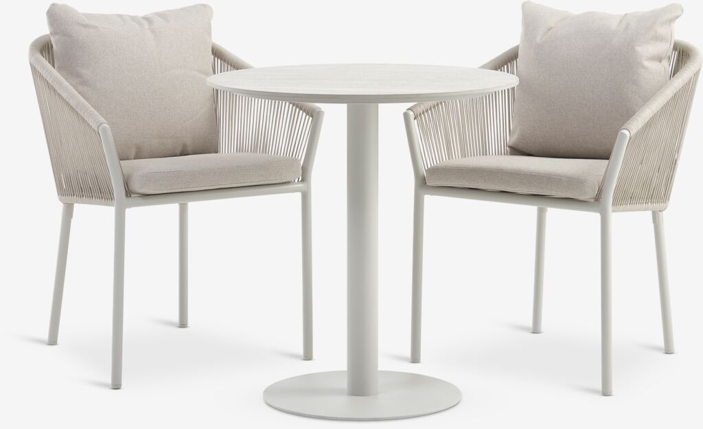 2-istuttava parvekesetti. Pöytä: Teräs ja sintrattu kivi. Sintratusta kivestä valmistettu pöytälevy on kulutusta, tahroja ja lämpöä kestävä. Ø70 x K72 cm. Tuoli: Alumiini ja polyesteri. Sis. laadukkaat pehmusteet nopeasti kuivuvalla, strukturoidulla päällisellä. Pinottava.