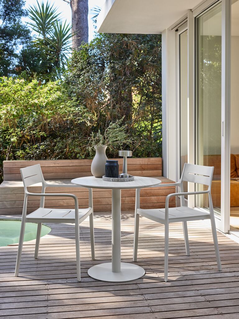 2-istuttava parvekesetti. Pöytä: Teräs ja sintrattu kivi. Sintratusta kivestä valmistettu pöytälevy on kulutusta, tahroja ja lämpöä kestävä. Ø70 x K72 cm. Tuoli: UV-suojattu muovi. Pinottava.