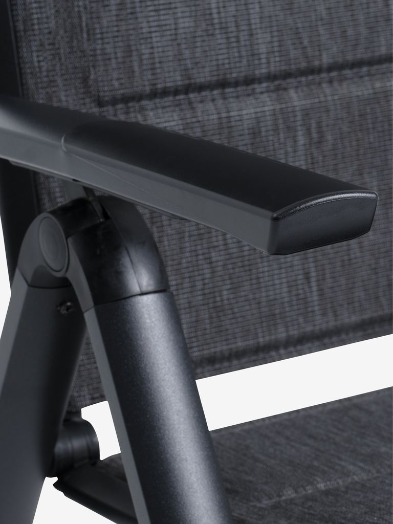 4-istuttava puutarhakalustesetti. Pöytä: Alumiini ja puujäljitelmä. L90 x P150 x K74 cm. Tuoli: Alumiini, verkkopunos ja nopeasti kuivuva vaahtomuovipehmuste. 6 asentoa. Kokoontaitettava.