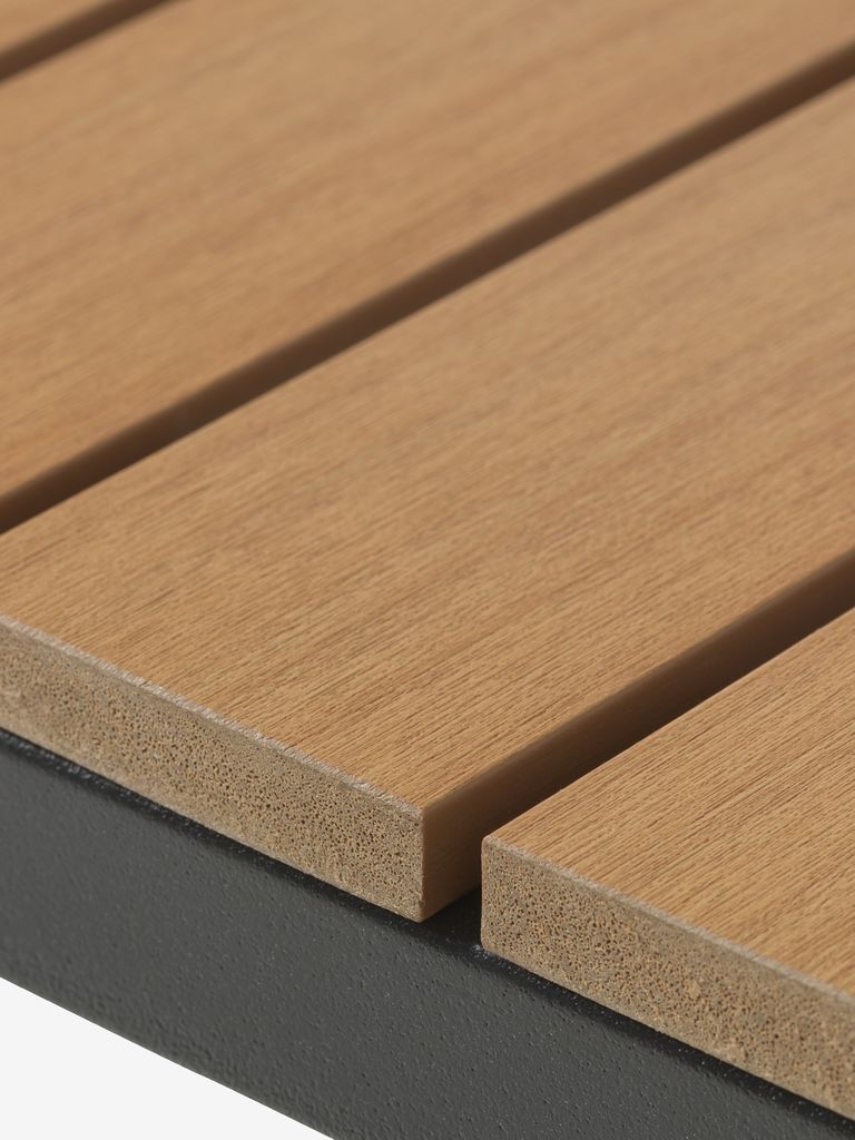 | Materiaali | Runko: Alumiini on kevyt ja tyylikäs materiaali, joka ei ruostu. Alumiini ei vaadi hoitoa ja on helppo puhdistaa kostealla liinalla. Puujäljitelmä on huoltovapaa synteettinen materiaali joka jäljittelee luonnollisen puun rakennetta. Se on tehty muovista, kuten polystyreenistä, joka on kestävä ja vettähylkivä materiaali. Puujäljitelmä on UV-suojattu, mikä takaa värien hyvän säilymisen pinnoilla. |