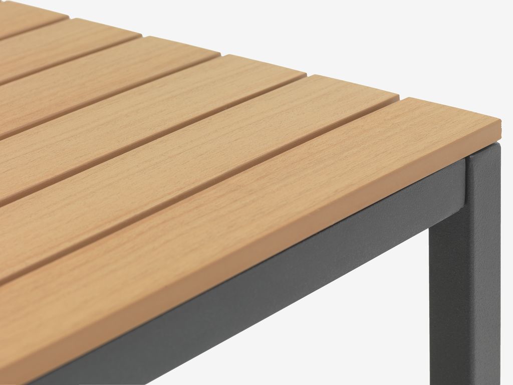 | Materiaali | Runko: Alumiini on kevyt ja tyylikäs materiaali, joka ei ruostu. Alumiini ei vaadi hoitoa ja on helppo puhdistaa kostealla liinalla. Puujäljitelmä on huoltovapaa synteettinen materiaali joka jäljittelee luonnollisen puun rakennetta. Se on tehty muovista, kuten polystyreenistä, joka on kestävä ja vettähylkivä materiaali. Puujäljitelmä on UV-suojattu, mikä takaa värien hyvän säilymisen pinnoilla. |