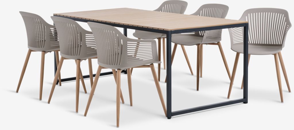 4-istuttava puutarhakalustesetti. Pöytä: Alumiini, teräs ja puujäljitelmä. L90 x P190 x K74 cm. Tuoli: Teräs ja muotoiltu, UV-suojattu muovi.