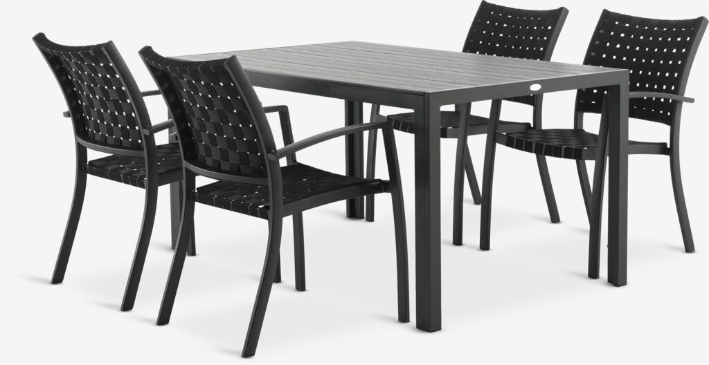 4-istuttava puutarhakalustesetti. Pöytä: Alumiini ja puujäljitelmä. L90 x P150 x K74 cm. Tuoli: Alumiini ja polypropeeni. Pinottava.