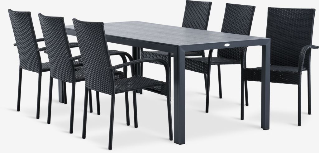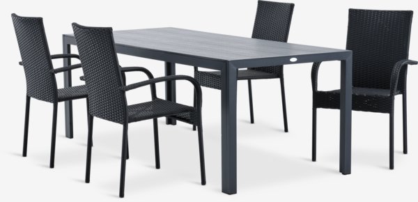 4-istuttava puutarhakalustesetti. Pöytä: Alumiini ja puujäljitelmä. L90 x P205 x K74 cm. Tuoli: Teräs ja polyrottinki. Pinottava.