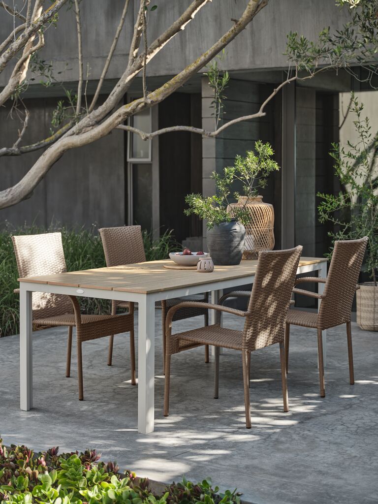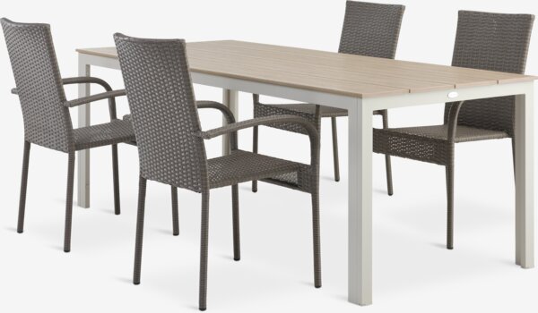 4-istuttava puutarhakalustesetti. Pöytä: Alumiini ja puujäljitelmä. L90 x P205 x K74 cm. Tuoli: Teräs ja polyrottinki. Pinottava.