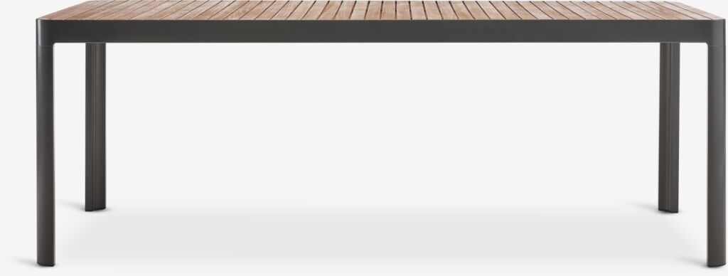 4-istuttava puutarhakalustesetti. Pöytä: Alumiini ja öljytty FSC®-kovapuu. L91 x P211 x K75 cm. Tuoli: UV-suojattu muovi. Pinottava.