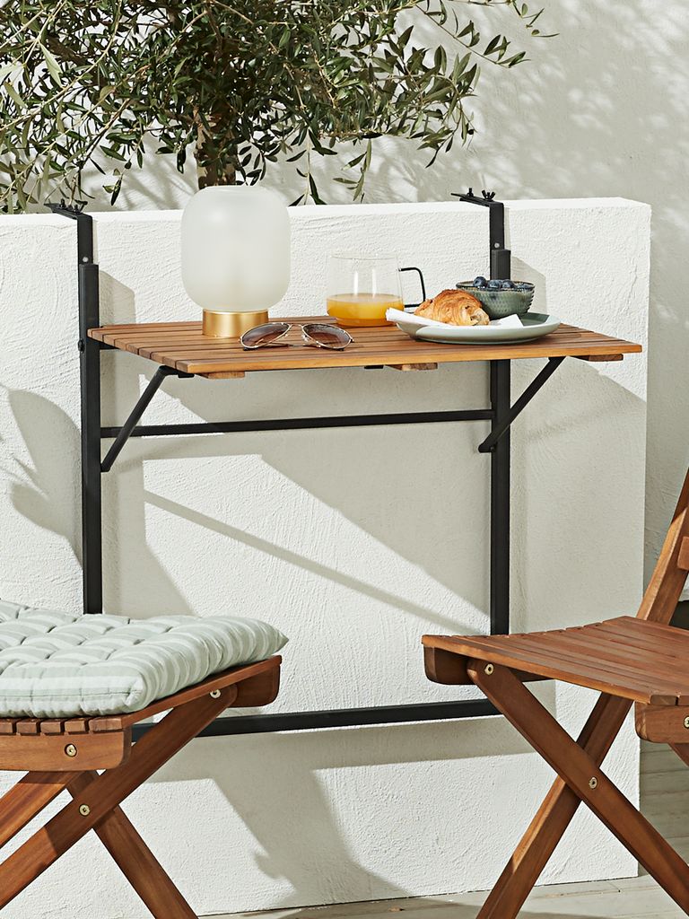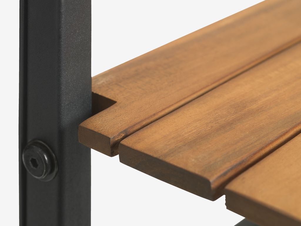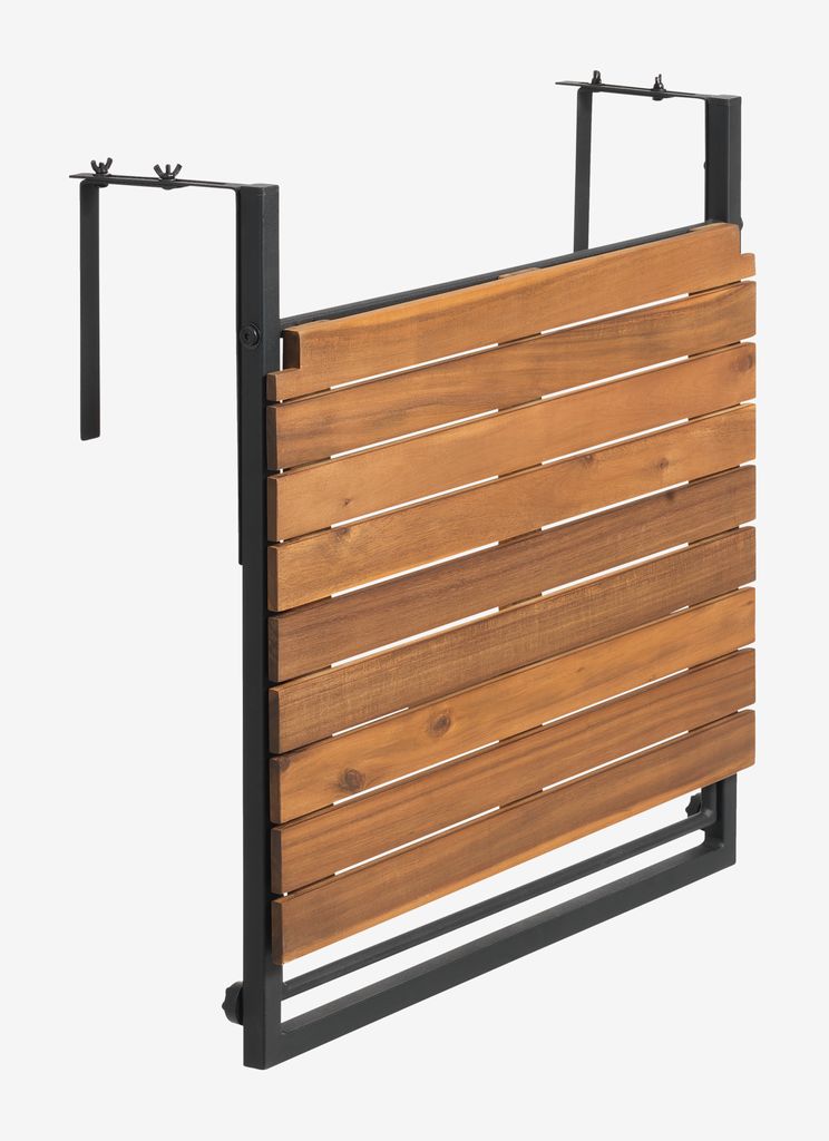 Parvekepöytä, jonka pöytälevy on öljyttyä FSC®-kovapuuta ja musta runko galvanoitua terästä. Rungossa on ruuvit, joilla voi säätää korkeutta ja etäisyyttä parvekkeen kaiteesta. Kun pöytä ei ole käytössä, se voidaan taittaa tilan säästämiseksi. Kestävä puu on öljykäsitelty sen suojaamiseksi ja luonnollisen värin korostamiseksi. Säännöllistä öljyämistä suositellaan värin ylläpitämiseksi ja kosteudelta suojaamiseksi. Teräs on galvanoitu, mikä auttaa suojaamaan sitä kulutukselta ja ruosteelta. L43 x P57 x K61 cm