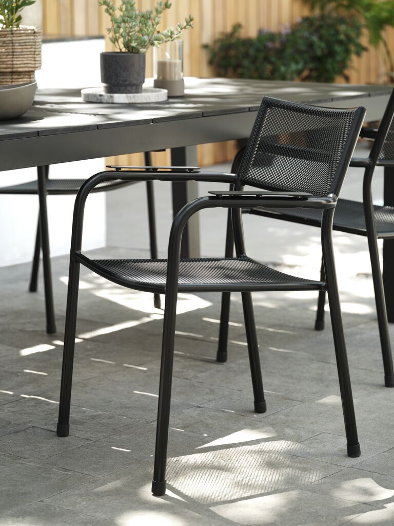 Musta pinottava tuoli, jonka istuin ja selkänoja ovat teräsverkkoa ja runko terästä. Teräs on käsitelty ruostumista estävällä Durasint®-pinnoitteella. Puutarhatuoli voidaan pinota, mikä helpottaa varastoimista.