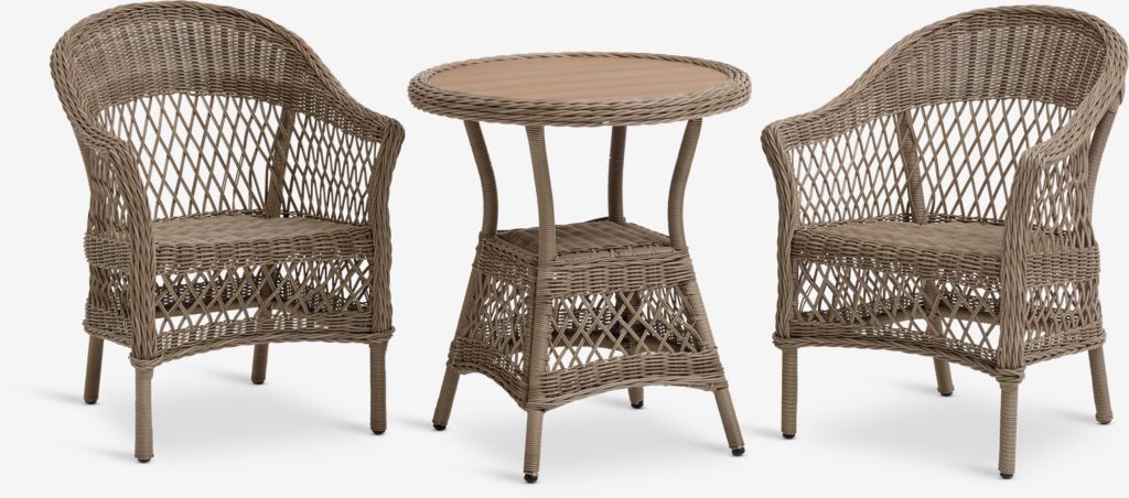 2-istuttava parvekekalustesetti. Pöytä: Alumiini, polyrottinki ja puujäljitelmä. Ø70 x K76 cm. Tuoli: Alumiini, galvanoitu teräs ja polyrottinki. Pinottava. L67 x K88 x S70 cm