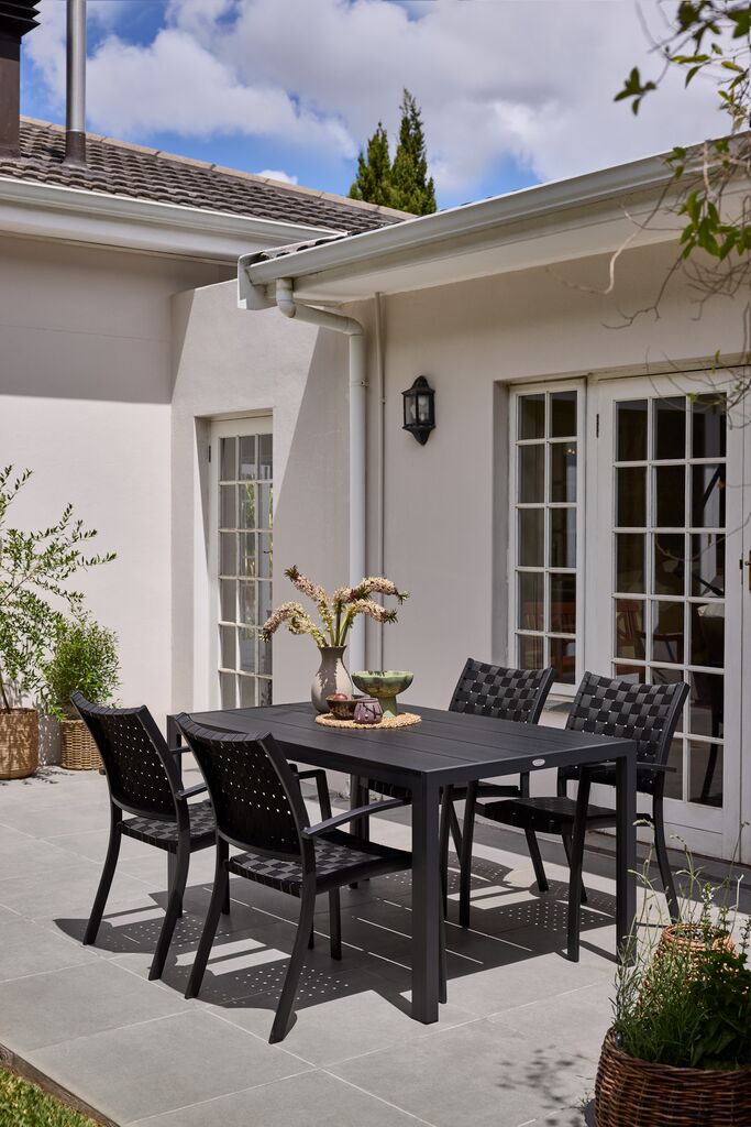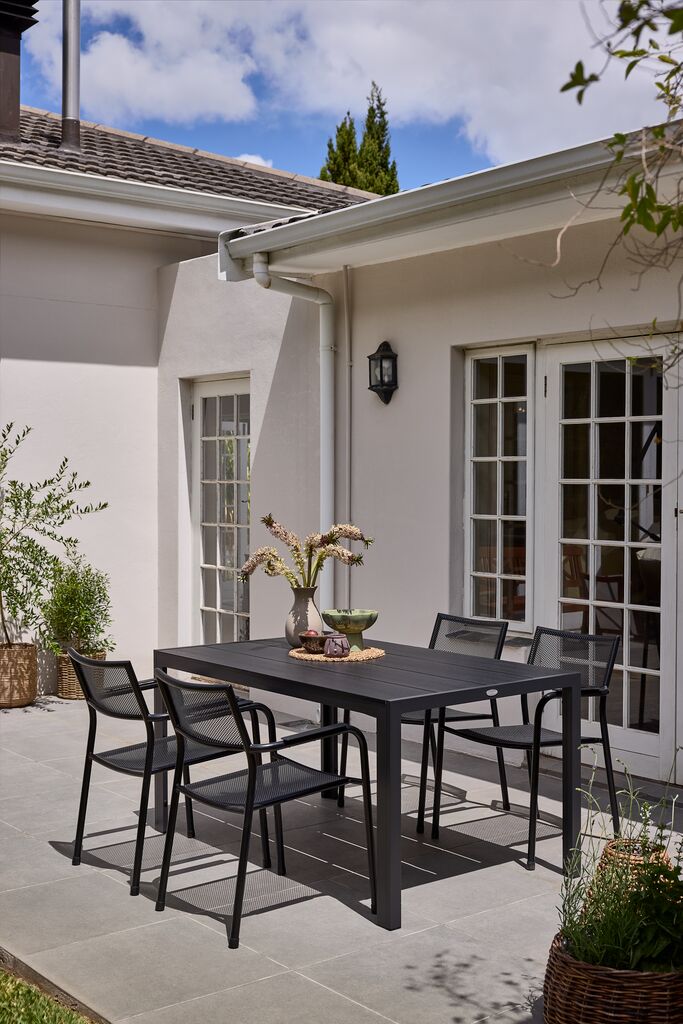 Musta puutarhapöytä, jonka pöytälevy on puujäljitelmää. Runko ja jalat jauhemaalattua alumiinia. Puujäljitelmä näyttää luonnolliselta puulta, mutta sitä ei tarvitse huoltaa. Alumiini on kevyt ja tukeva materiaali, joka ei ruostu. L90 x P150 x K74 cm