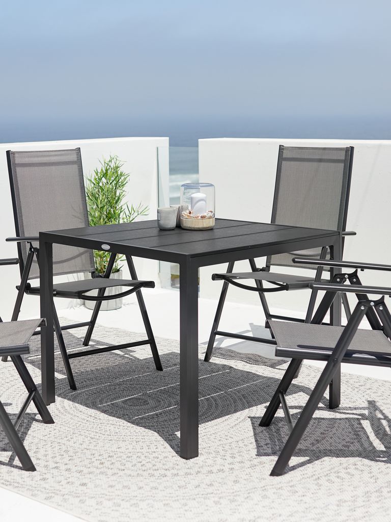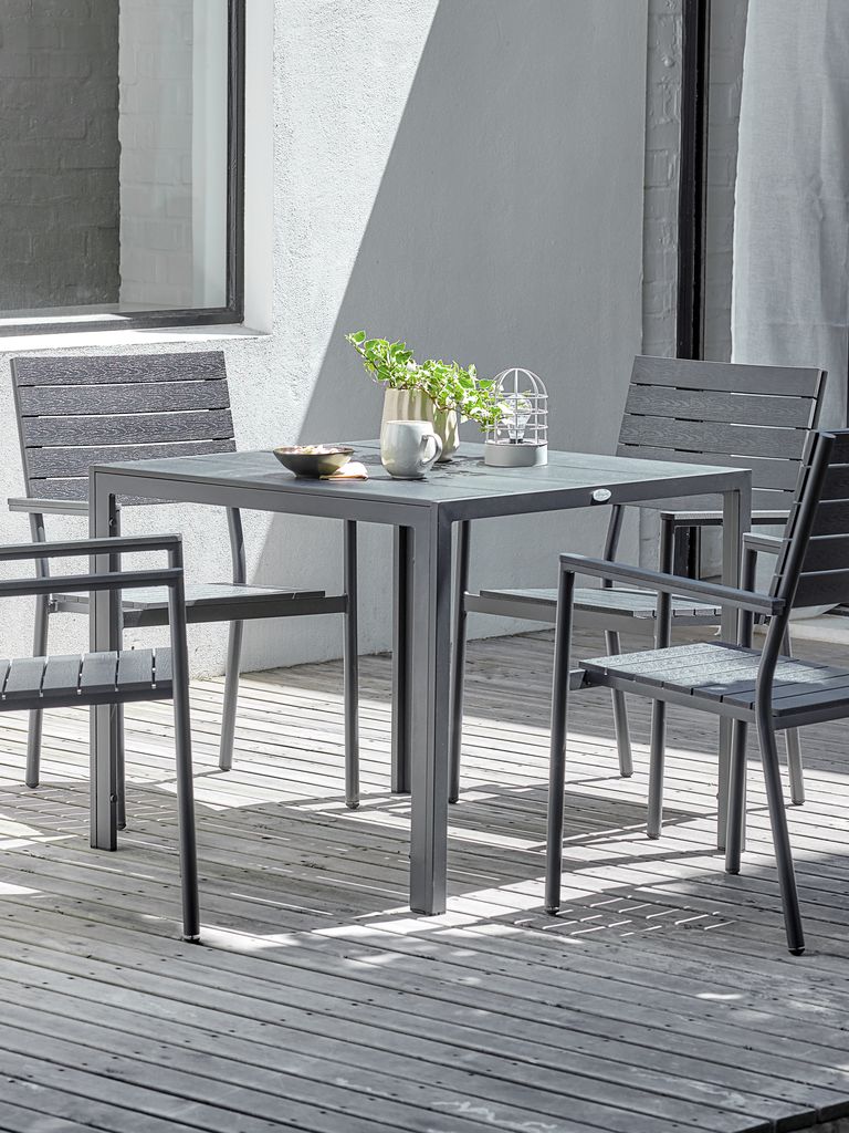 Musta puutarhapöytä, jonka pöytälevy on puujäljitelmää. Runko ja jalat jauhemaalattua alumiinia. Puujäljitelmä näyttää luonnolliselta puulta, mutta sitä ei tarvitse huoltaa. Alumiini on kevyt, mutta tukeva materiaali, joka ei ruostu. L90 x P90 x K74 cm
