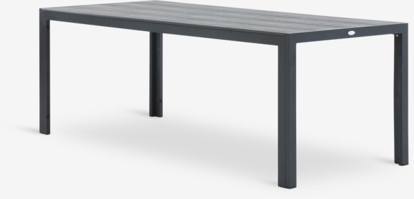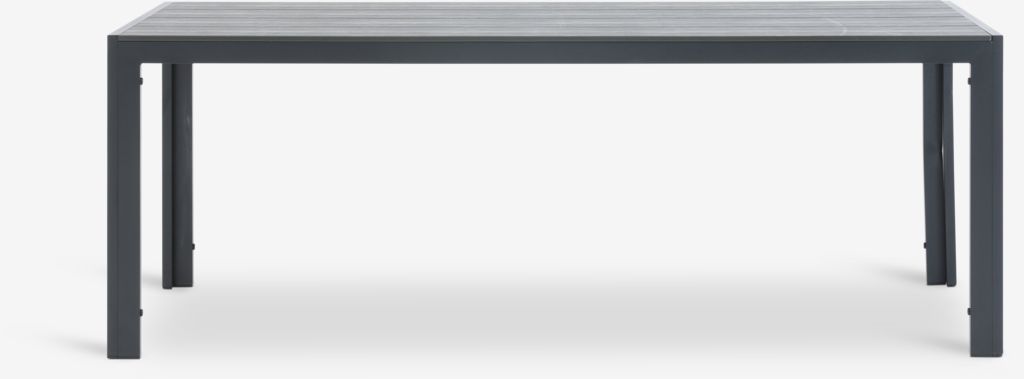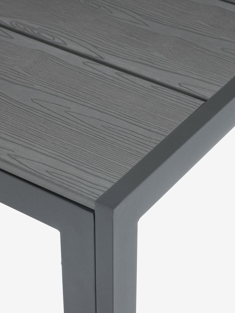 Harmaa puutarhapöytä, jonka pöytälevy on puujäljitelmää. Runko ja jalat jauhemaalattua alumiinia. Puujäljitelmä näyttää ja tuntuu luonnolliselta puulta, mutta sitä ei tarvitse huoltaa. Alumiini on kevyt, mutta tukeva materiaali, joka ei ruostu. L90 x P205 x K74 cm