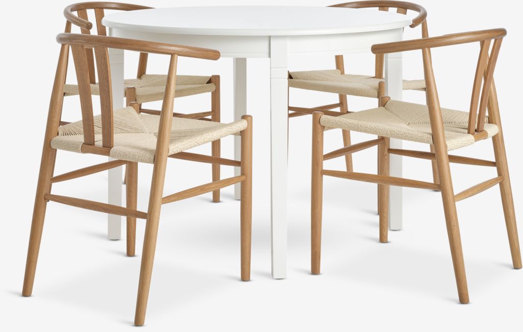 KIRKEBY + GUDERUPKIRKEBY Ø110 pöytä valkoinen + 4 GUDERUP tuoli lvär. tammi