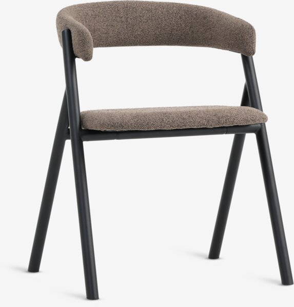 Ruokapöydän tuoli käsinojilla, jotka tuovat lisätukea ja mukavuutta, Tuolissa on pehmustettu istuin ja kaareva selkänoja, jotka on verhoiltu vaaleanruskealla kankaalla. Mustat teräsjalat.