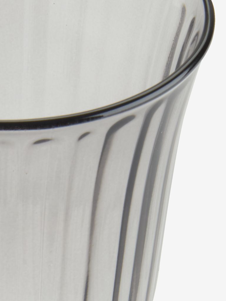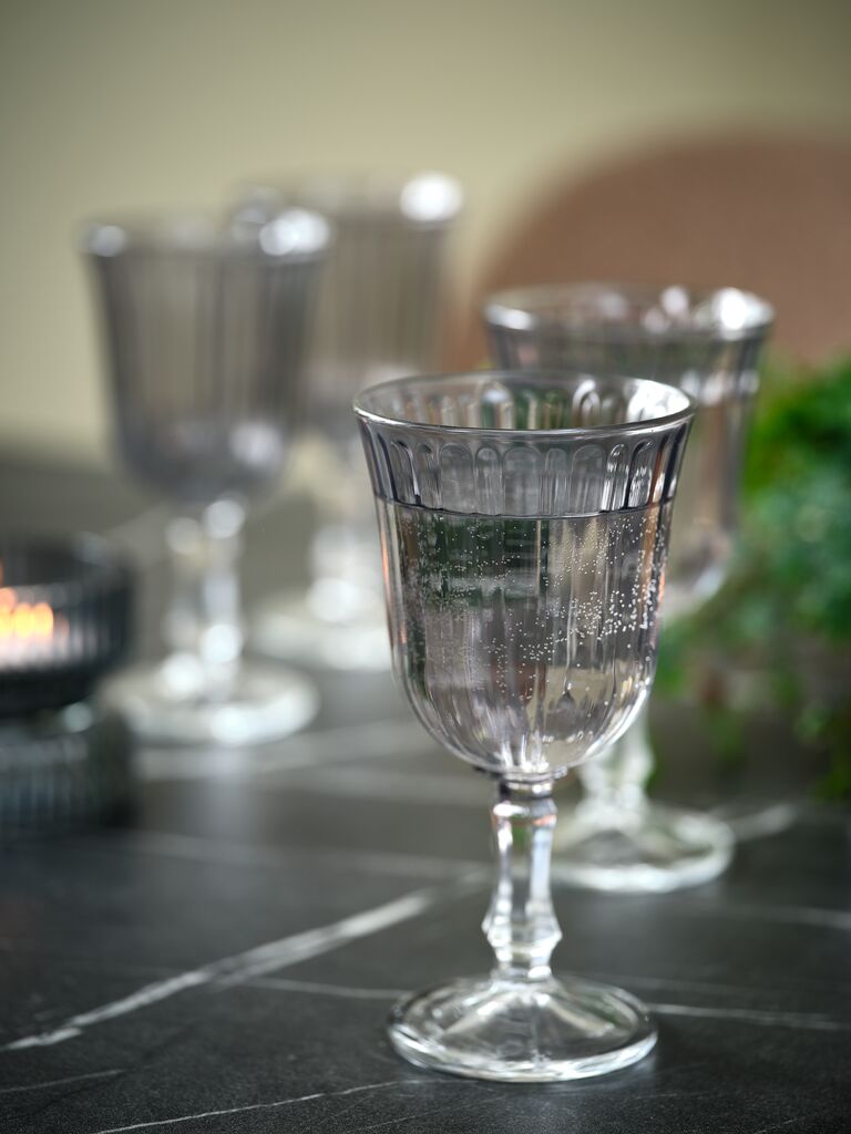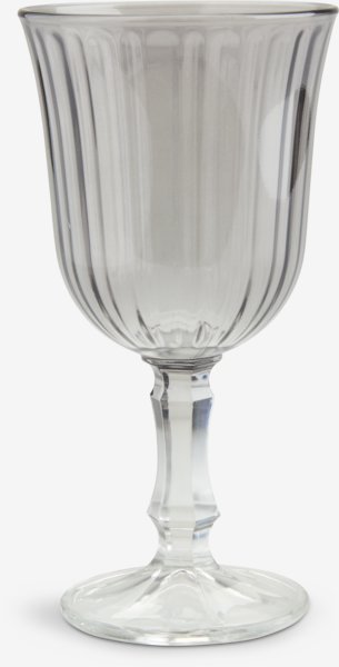 Harmaa viinilasi, jossa on romanttinen, uurrettu muotoilu. Tilavuus 24 cl. Astianpesukoneen kestävä. Ø8 x K16 cm